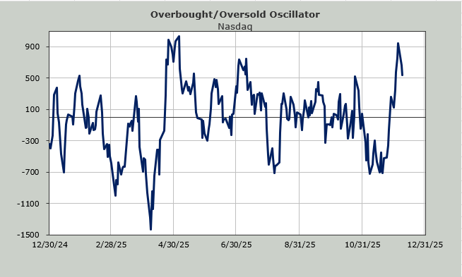 Having gotten overbought in mid-September, the 30-day moving average of the advance/decline line was on a steady move toward oversold until just prior to Thanksgiving. But one thing you can see is that the chart typically oscillates, meaning it goes up and down, from big minus readings (oversold) to big positive readings (overbought), but since that overbought peak in mid-September, it has been a grind.