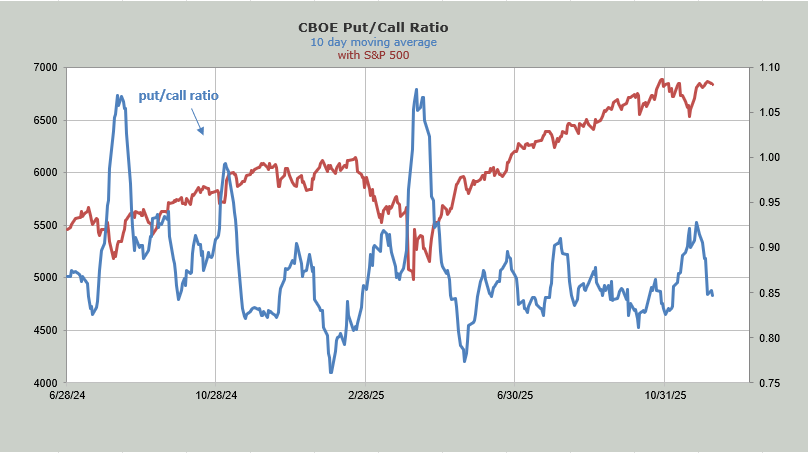 The ten-day moving average of the put/call ratio sits at .85. It’s no longer showing too giddy (as it did in late September when it got to .81. It is no longer showing fear as it did when it got to .93 just before Thanksgiving. Here, too, I would call this just complacent, not giddy.