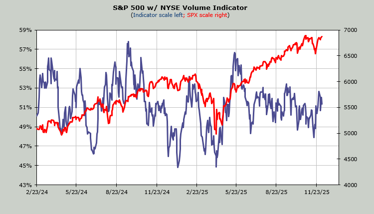 The Volume Indicator looks very similar to the 30-day moving average of the a/d. It has hovered back and forth over the 50% line since July. You can see the oversold reading (48%) just before Thanksgiving, but it’s not been very dynamic, and it sits at 51% as of this writing.