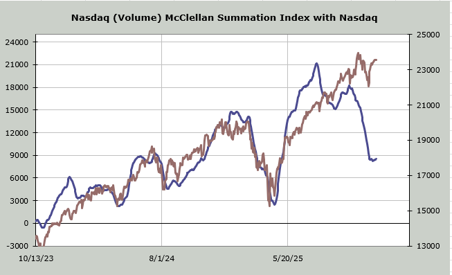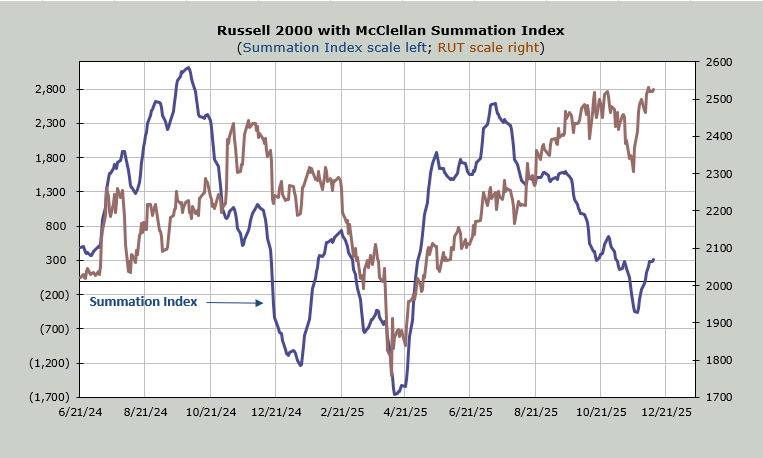 Yesterday, we looked at the McClellan Summation Index, and I noted that the cushion (what it will take to halt the rise) is small. It remains small. A net differential of -400 advancers minus decliners on the NYSE would halt this rise. Prior to this recent turn, the persistence was to the downside since July.