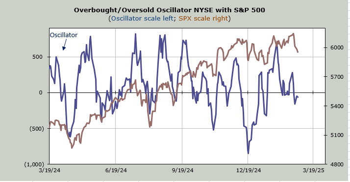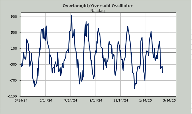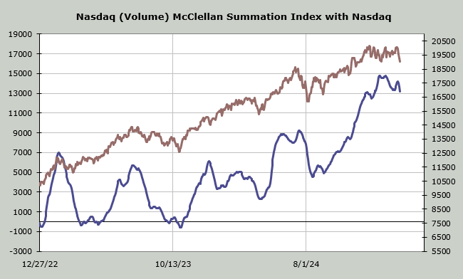 The Nasdaq McClellan Summation Index turned south a few weeks ago. That’s the blue line. It continues to head south. Yet the selling over the last four trading days has gotten it to the point where this indicator now needs net volume of +9.6 billion shares to halt the slide.