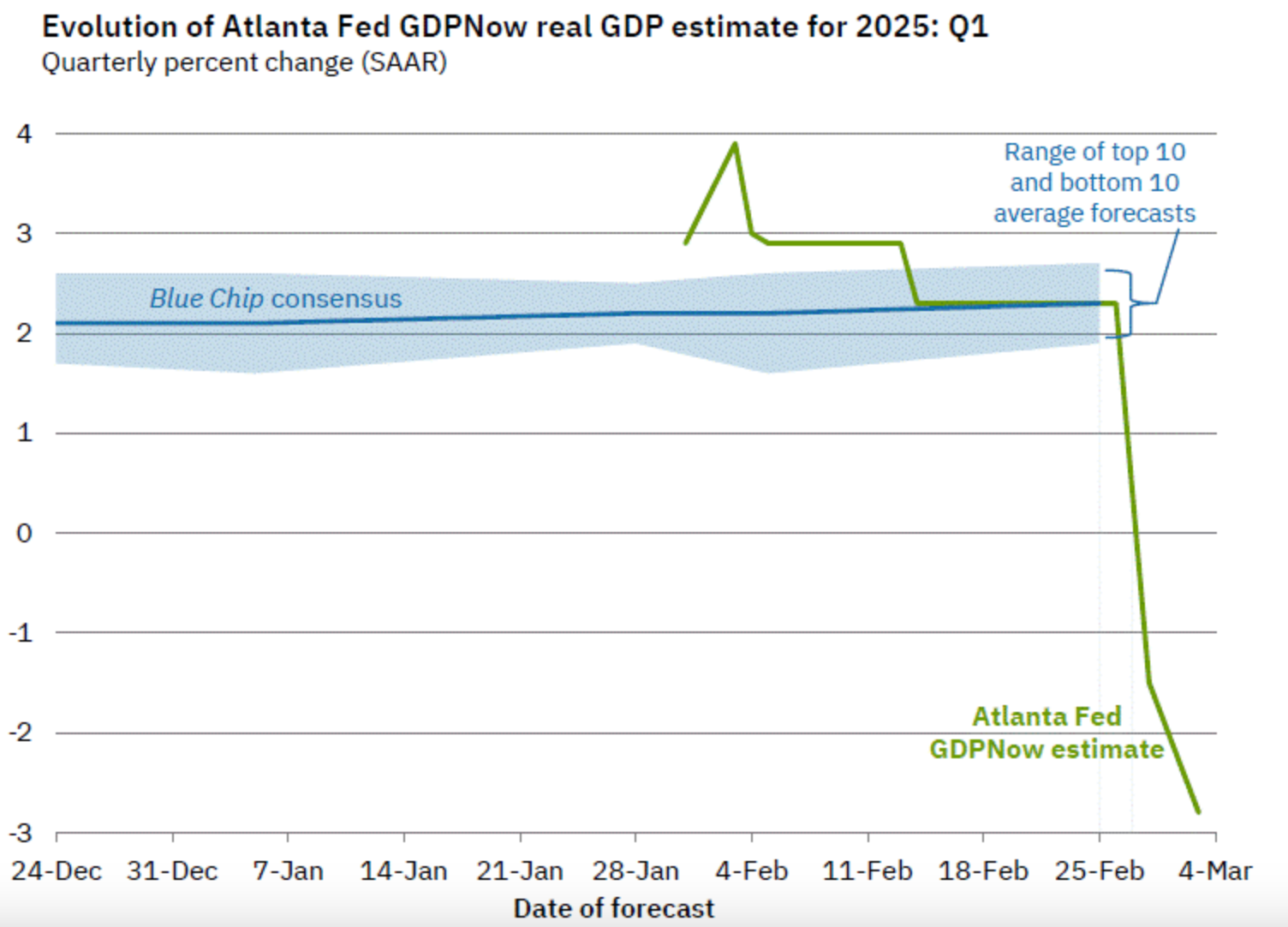 Much of the chatter on Monday involved the recent swing in the GDPNow model. Over the past few days, the Atlanta Fed’s first quarter GDPNow estimate has dropped sharply, suggesting a decline of 2.8%.