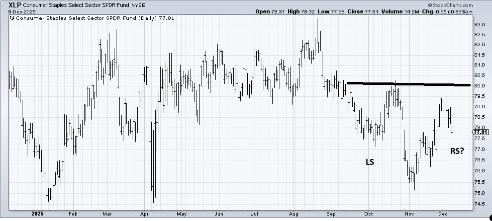 With that in mind, take a look at (XLP) , an ETF to be long the staples. No one seems to like them. Heck, it’s not a pretty chart. It has done nothing all year. But this time of the year – well, as we head into 2026 — sometimes folks like to take a flyer on something that has been down and out. I am going to see if XLP can hold this 77 area on this trip down. The hate is surely there, so maybe there’s an upside trade in it.