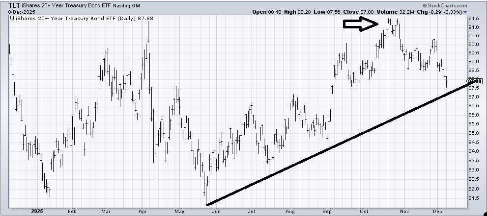 I should finish with the bonds. You know where I stand (see yesterday’s missive), but it seems the majority are now expecting a "hawkish cut." The Fed might do a hawkish cut, but look at the chart of (TLT) heading into the October meeting when there was a hawkish cut (arrow). No one expected it, and TLT was pushing up against that 92-93 resistance I kept harping on about. Folks were looking for a breakout. Now TLT is coming into support, and after the move it has had in the month of December, getting oversold. Sometimes it’s not the news but where the underlying security is when the news arrives.