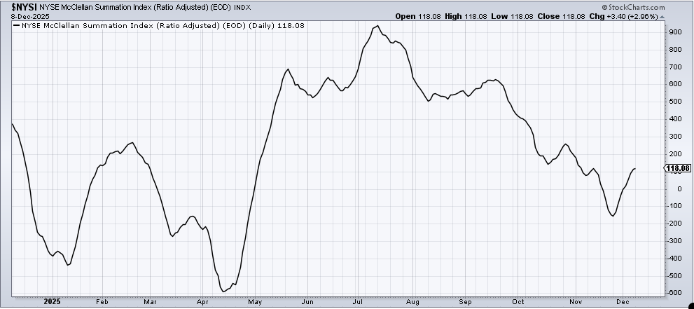 Aside from that, not much else changed. I should, however, note that last week the McClellan Summation Index came into the week with a cushion of -2600, meaning it would take a net negative advance/decline line of -2600 to get the push up in the indicator to halt the rise. I thought that was a decent cushion.