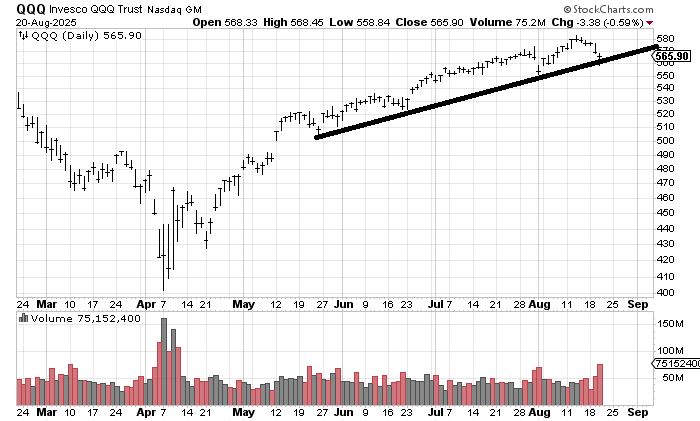 Now the QQQs did trade 75 million shares on Wednesday and they bounced off the uptrend line I drew in last time. I expect a bounce after five straight down days for the QQQs but that, too, is another change: the QQQs have not notched five straight down days all year.