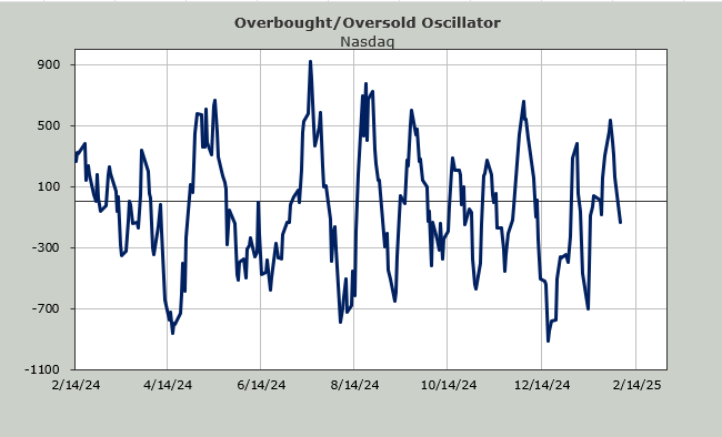 But that weak breadth has helped the Overbought/Oversold Oscillator come back to the zero line. It’s not oversold yet but this is the way it ought to pull back to get oversold again.
