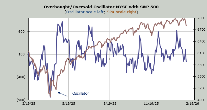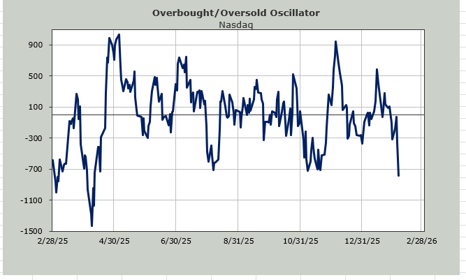 I do think we are heading toward an oversold condition, as I have noted all week. My Overbought/Oversold Oscillator is now finally at the bottom of the page. Eight of the next ten trading days, this ten-day moving average will drop negative numbers.