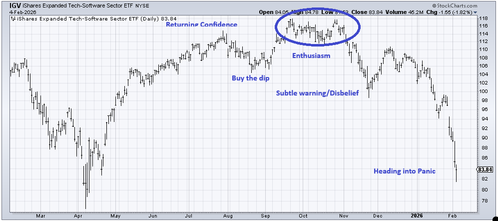 I did take the liberty of matching up the chart of IGV with the Sentiment Cycle created by my mentor, Justin Mamis. I think it fits rather well (Thursday’s action is not on the chart). I do think we are heading toward panic.