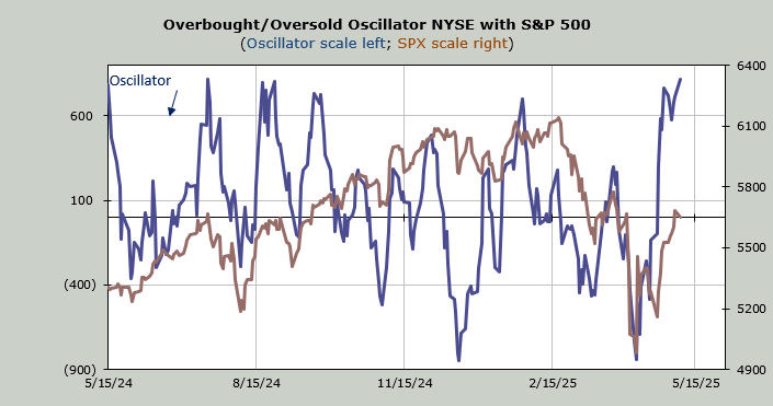 The 30-day moving average still has some red numbers to drop (next week as well), so I don’t consider that as overbought yet. I do anticipate it will reach an overbought condition when it stops dropping red numbers (the week prior to Memorial Day).