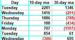 However, with the Oscillator, we are able to look at the numbers we are dropping off the ten-day moving average of net breadth. On the table below, you will see the first column shows the numbers we are dropping for the ten-day moving average, and the next column shows the numbers we are dropping off the 30-day moving average.
