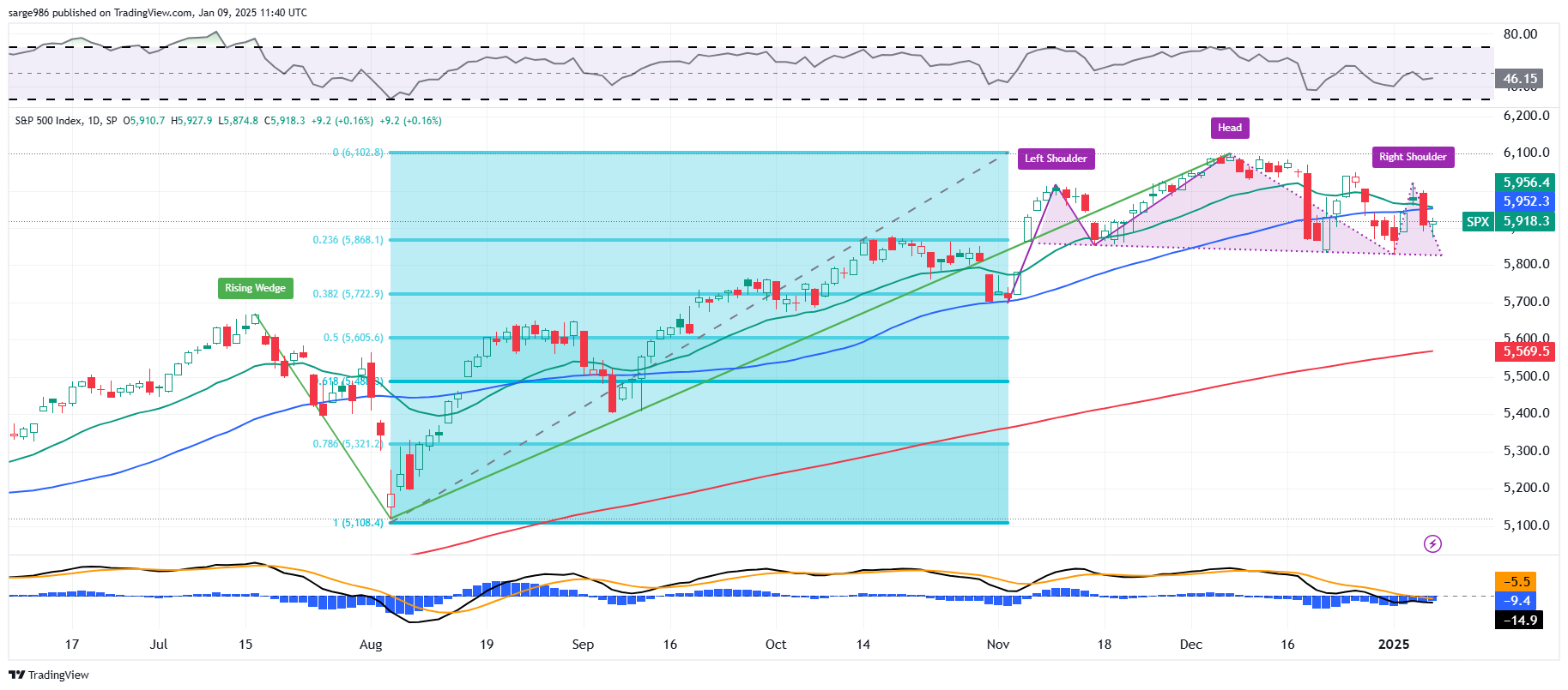 Readers will note in the chart above that the S&P 500 has developed a head-and-shoulders pattern (which is a pattern of bearish reversal) stretching from very late October into 2025. The pattern displays a neckline at 5827, which would be the downside pivot.