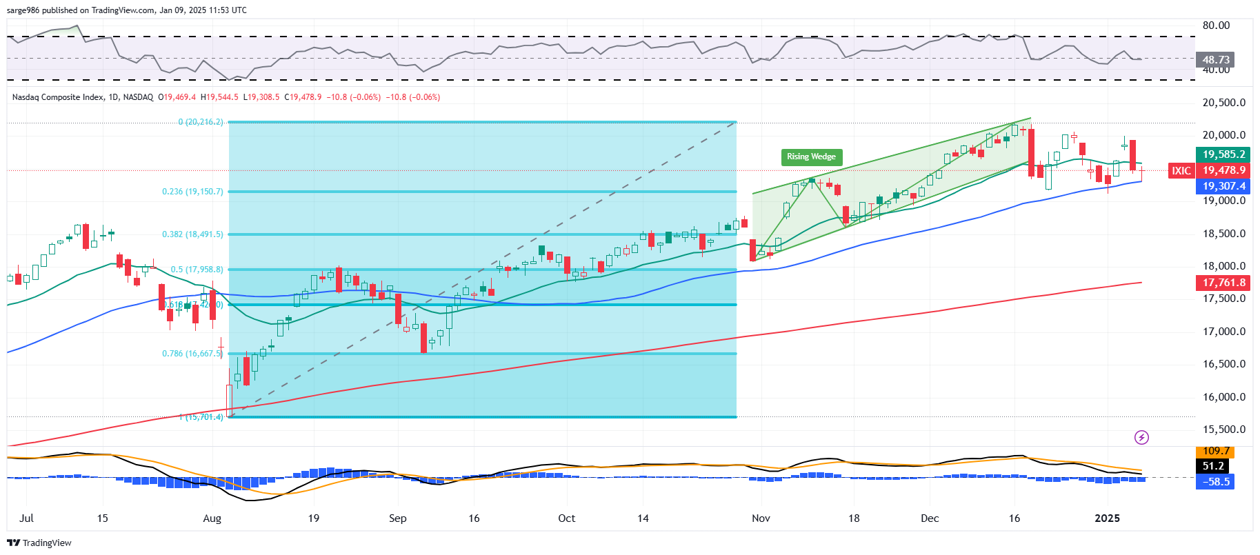 The Nasdaq Composite presents us not with a head-and-shoulders pattern, but a rising wedge pattern, which is still a pattern of bearish reversal. Currently this index has been able to hang onto support at its 50-day SMA, which could be crucial on Friday after the December jobs data is released.