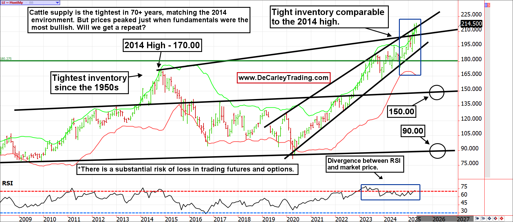 With everyone all bulled up on the board, in the pen, and in their minds, it is hard to imagine prices revisiting $150.00, let alone $100.00, but history says that’s not only possible but probable. The monthly chart reveals a divergence between price and the Relative Strength Index (RSI) technical oscillator. This pattern almost always ends in an abrupt trend reversal, but it can take several months to unfold, making timing a significant challenge.