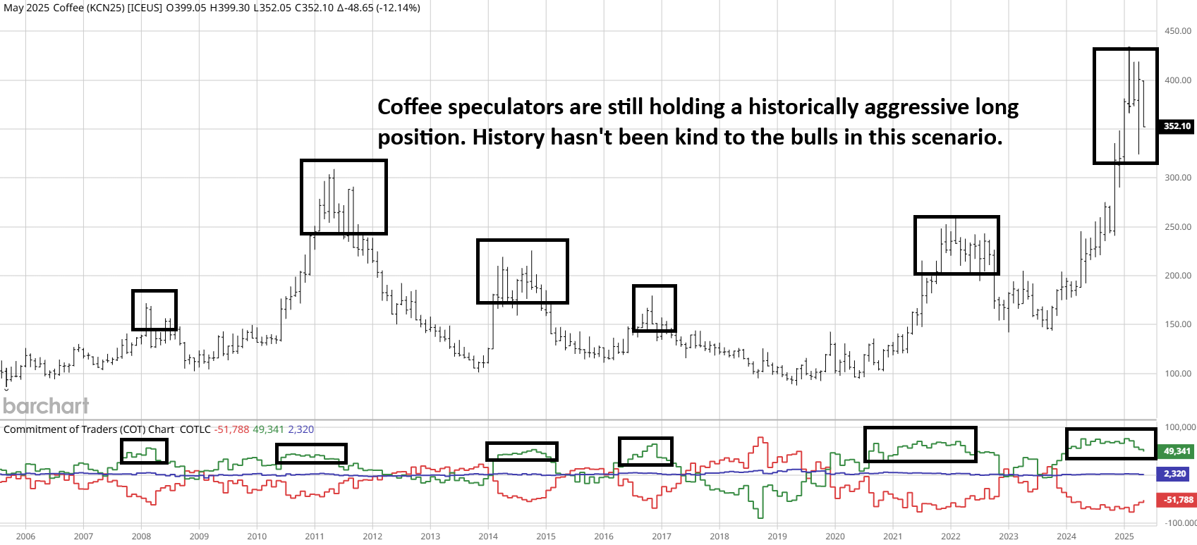 It might come as a surprise to see this commodity on the list, given that it has retreated 70 cents from its April high. However, despite the pullback, analysts remain wildly bullish, and speculators continue to hold oversized long positions. We can’t help but notice the similarities between the 2020 to 2025 coffee market and that of 2007 to 2012. If this is a repeat of that cycle, the coffee market could, and should, eventually give back the entire second rally. That would leave prices somewhere in the $1.50 range.