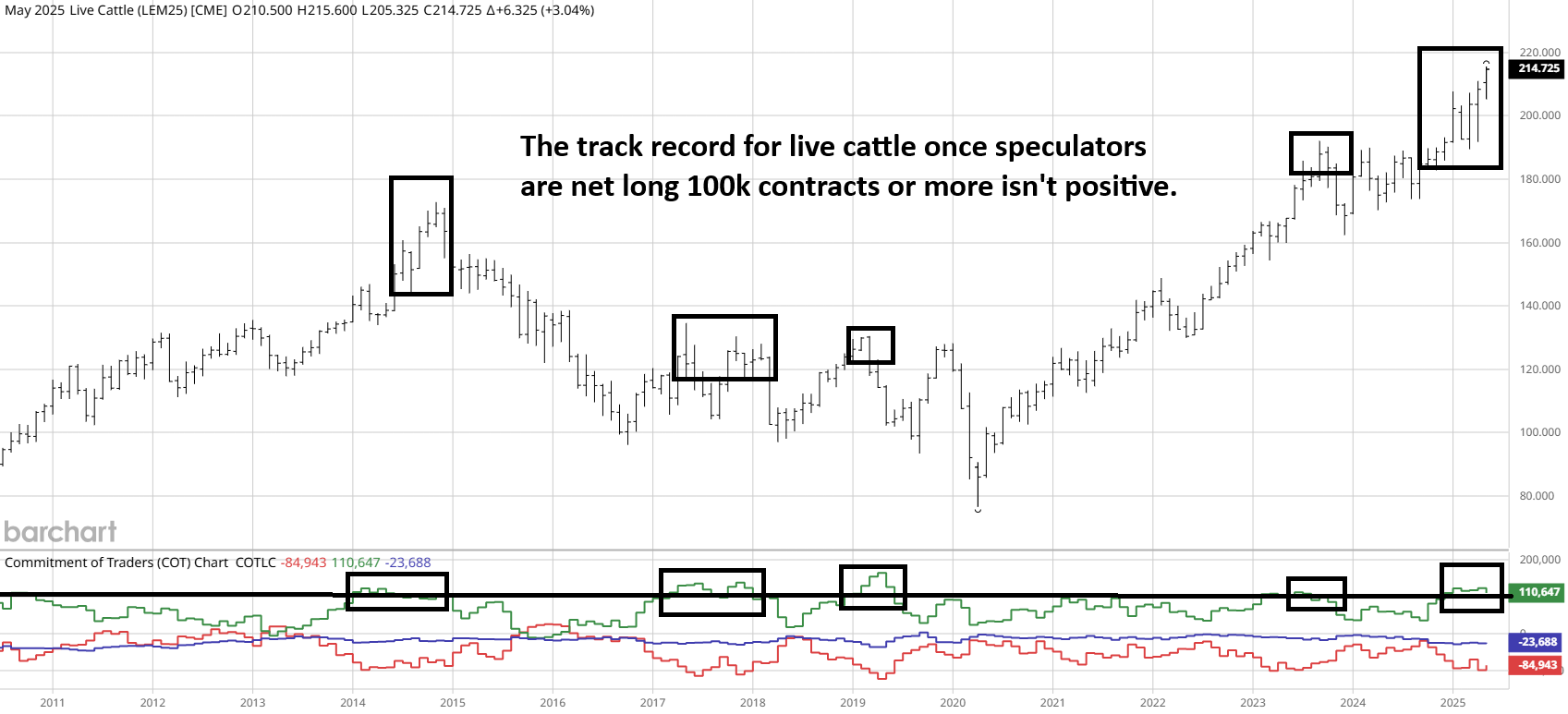 However, with 78% of industry insiders bullish and speculators holding one of the largest net long positions in history, this market is an accident waiting to happen. Previously, whenever large speculators were net long over 100,000 contracts in live cattle, the market broke hard; three of the four instances saw a $30 break in cattle, but the fourth occurred in 2014 and led to a break of $80!
