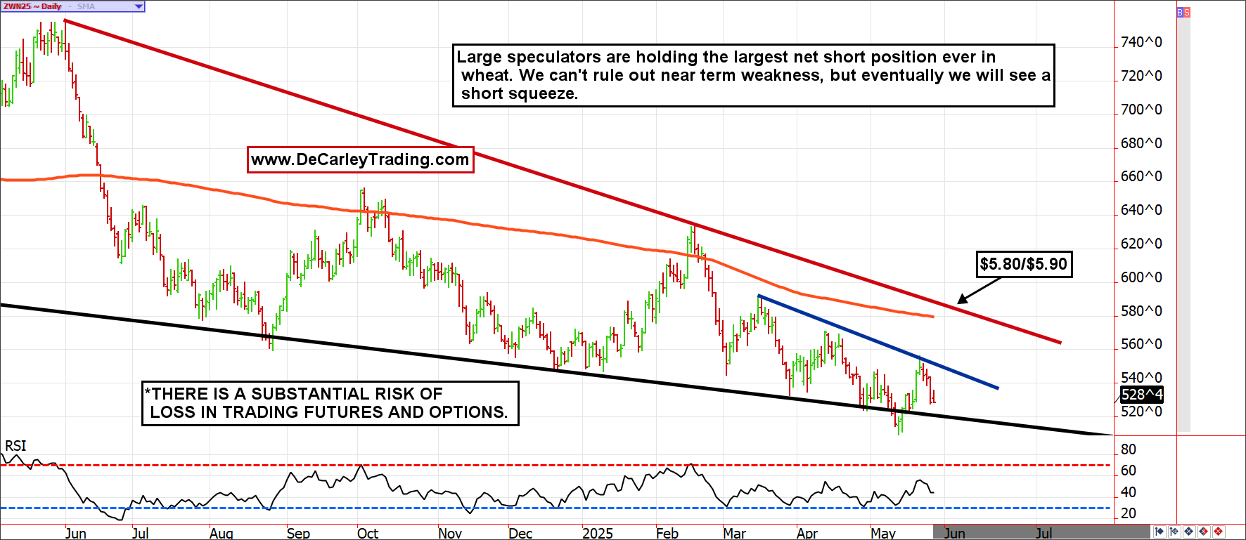 Narrowing in on the daily chart, a reverse head-and-shoulders pattern appears to be forming. Even so, it could mean wheat retests the daily chart downtrend line or pokes a little below it, but we don’t think this is a place to be short wheat, even though the majority are positioned as such. In fact, this might be the best time in a decade to be a wheat bull.