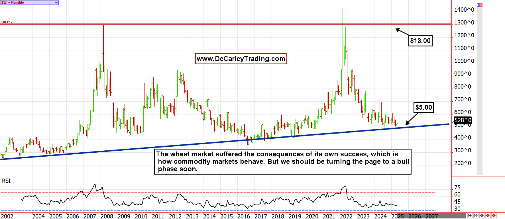 The 2016 low was nearly $4.00, roughly a dollar below current pricing. However, the 25-year trendline suggests $5.00 wheat is the new $4.00. Coincidentally, the previous trendline test occurred near $3.00, and each of these tests of support has occurred roughly 10 years apart. Markets don’t always repeat, but they often rhyme.