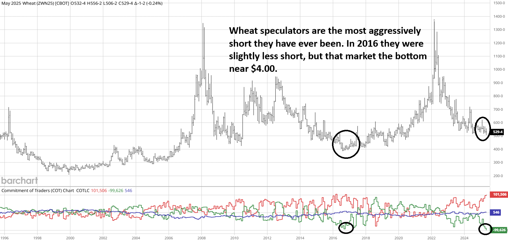 Large speculators are holding the most prominent bearish position ever recorded in wheat futures. However, there was an occurrence at the tail end of the 2016 commodity bear market in which this group of traders was almost as short. The aftermath was an unwinding of that position that pushed prices 50% higher within a year and eventually paved the way for a tripling of the 2016 price.