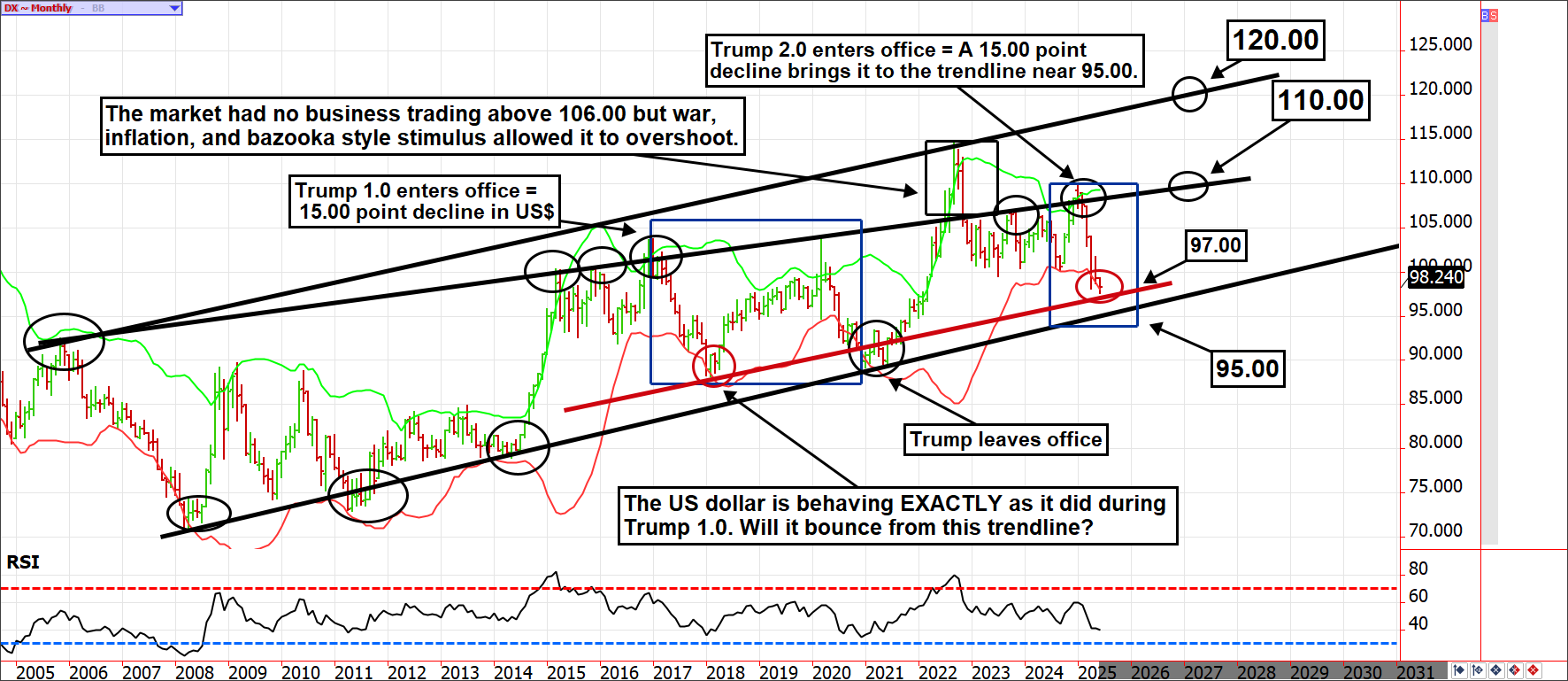 It is worth noting that the path of the greenback during Trump 2.0 is nearly identical to that of Trump 1.0. If we are to continue mimicking 2017, the dollar should fund support on the red trendline in the accompanying monthly chart near 97.00, triggering a significant rally. But if that level fails, the odds of support near 95.00 holding to pave the way for a stunning dollar rally as the overcrowded short position on the dollar is unwound. Once the process begins, we expect the dollar index to reach heights in the 110.00 area. This would cause significant damage to asset prices, particularly commodities such as gold, silver, and crude oil.
