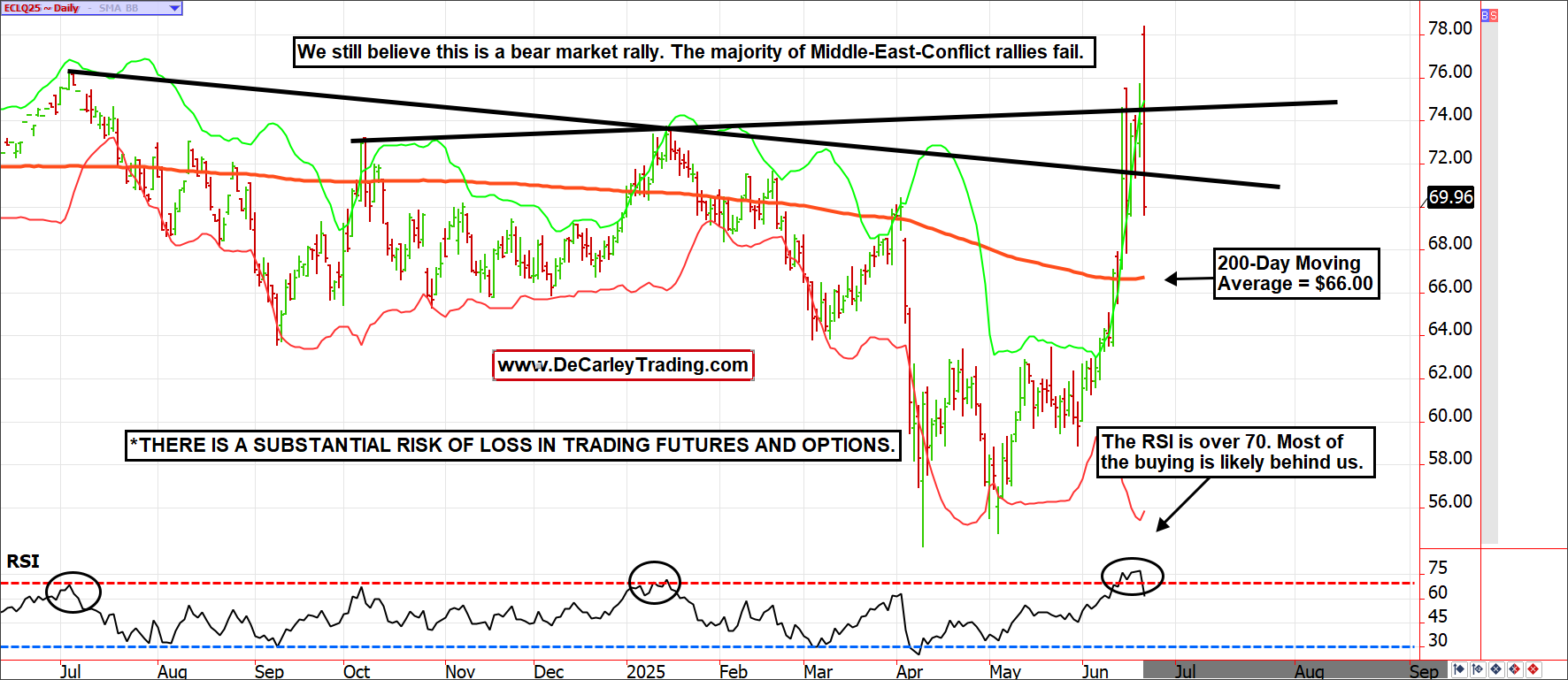 The vast majority of Middle East oil rallies fail, making way for new lows. We suspect that is precisely what we will see in the coming weeks or months. Remember, $65.00 has been a historically significant price point; even if this marks the beginning of a new bull market (which we do not believe), we should at least retest this level. Furthermore, if prices slip below $65.00 again, the bulls will likely begin to liquidate their positions. Despite the market taking a detour, the low-$50.00s to high-$40.00s range remains in play.