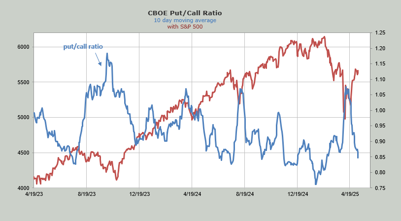 Finally, the ten-day moving average of the put/call ratio is now at 0.85. My estimation is that next week, probably regardless of what the market does, we see this moving average turn up. So here, too, we have to say the sentiment has shifted.