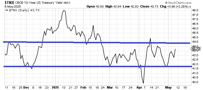 Then there are the bonds. Stocks are having quite a ride in the month of May, but bonds are going the other way as rates have gone from 4.20% to near 4.40% in just over a week. If this doesn’t stop at 4.50% as we get intermediate-term overbought, I’d consider that a negative.