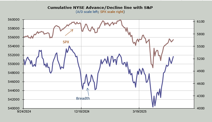 Thus far, breadth has been excellent. I know I show this chart often, but look at the blue line (breadth) and see how it is outperforming the S&P (brown). Notice that the high in February saw the blue line at a lower high while the S&P made a higher high. That is not the case now.