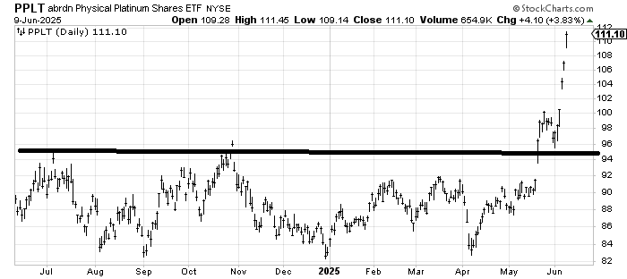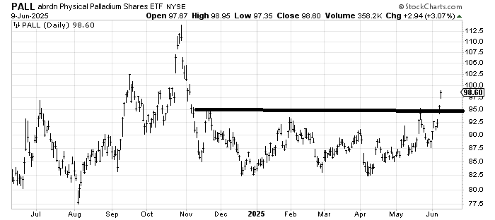 Away from that, you might recall I highlighted the base in the chart of Palladium a few weeks ago using the ETF PALL. It’s done well and has some room to run, but the metal folks have seemingly gotten even more excited over is Platinum. It hasn’t gotten much airtime, but if you are trading it, know that the Daily Sentiment Indicator (DSI) is now at 86 for Platinum (it is only 67 for Palladium). It probably means this cohort of metals needs a few days of rest/pullback.