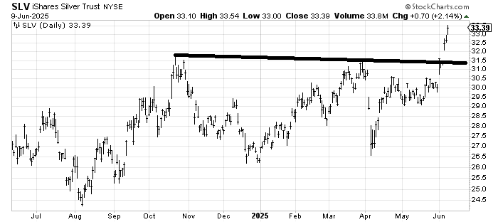 Silver, too, has finally broken out (maybe this is where all the hot gold money has gone). My measured target is around 35-ish, but I want to report that the DSI here is also 86. The curious thing is the folks on television haven’t even ‘discovered’ the moves in these metals yet. I can only guess that it is coming any day now. That will be the sign a pullback is imminent.