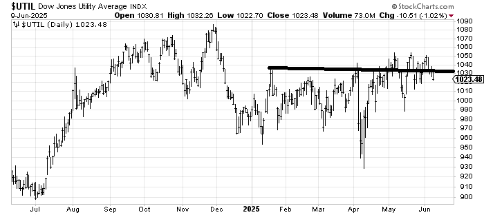 The Utilities had that terrific bounce off 990 in mid-May and looked as if they would finally break out over that 1050 area. But once again, the Utes got up there and fell back. Not to be deterred, they tried again in early June and have since fallen back one more time. Clearly, three times was not the charm.