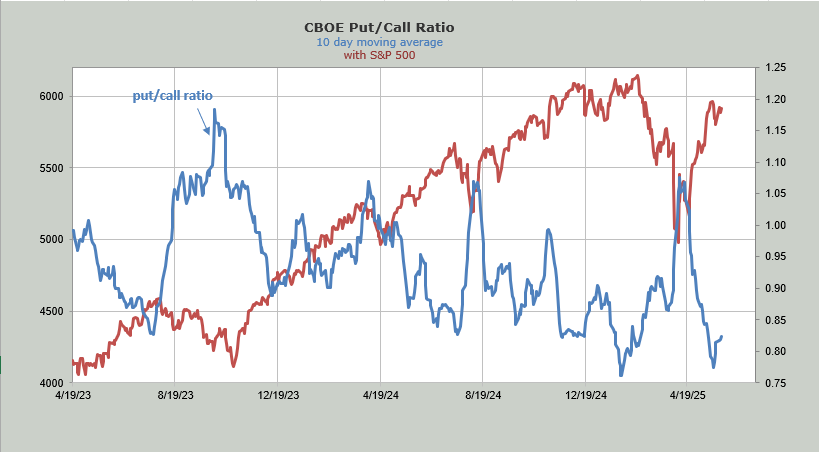 Sentiment is still hopeful but some indicators are now complacent. The 10-day moving average of the put/call ratio is complacent, having turned up last week.