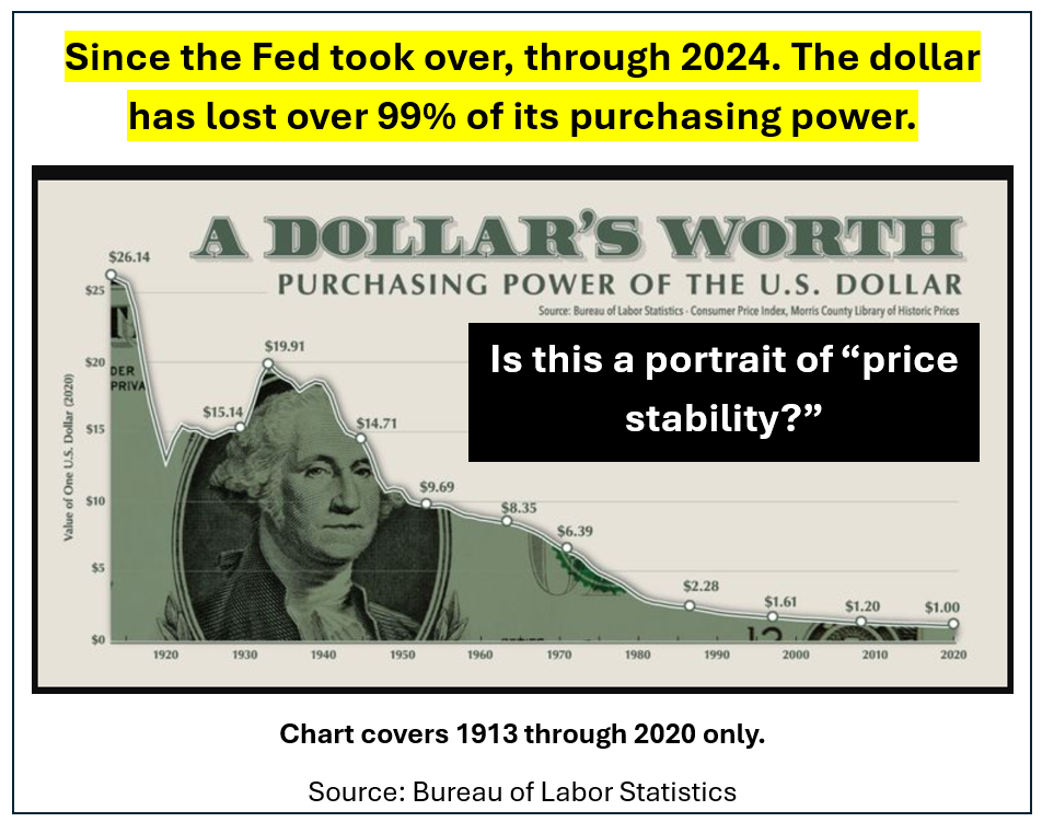 The chart below offers all the evidence needed to assign the Fed a failing grade. The graphic only extends through 2020. Since then, the dollar has dropped to under 1% of its pre-Fed-creation buying power.