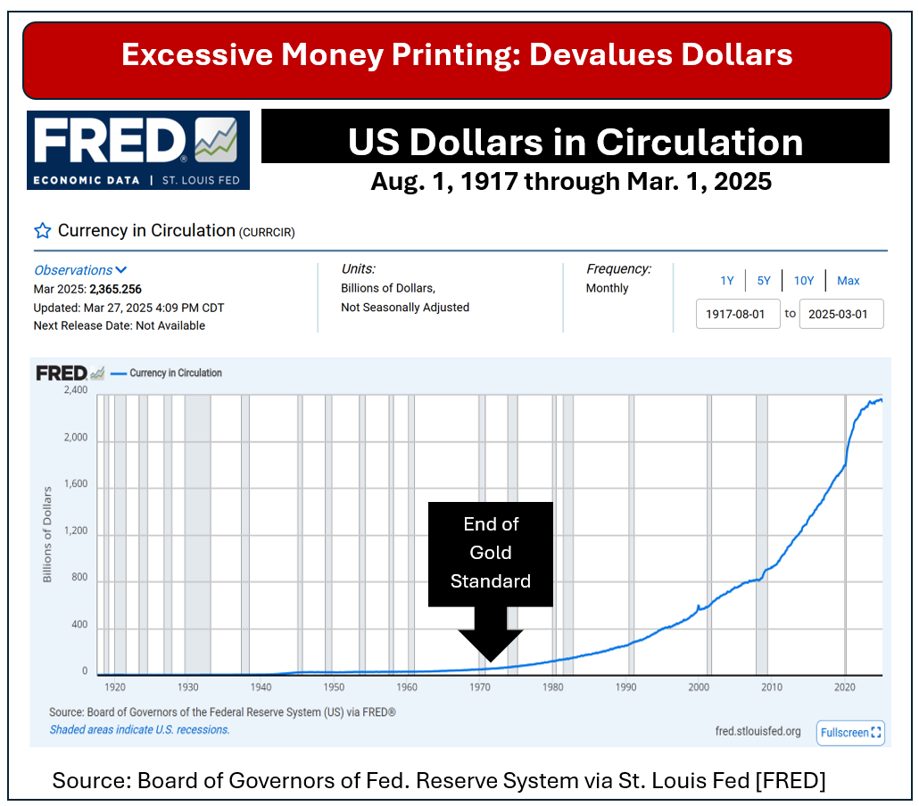 The chart below documents the story. Since the gold standard went by the boards, money in circulation skyrocketed.