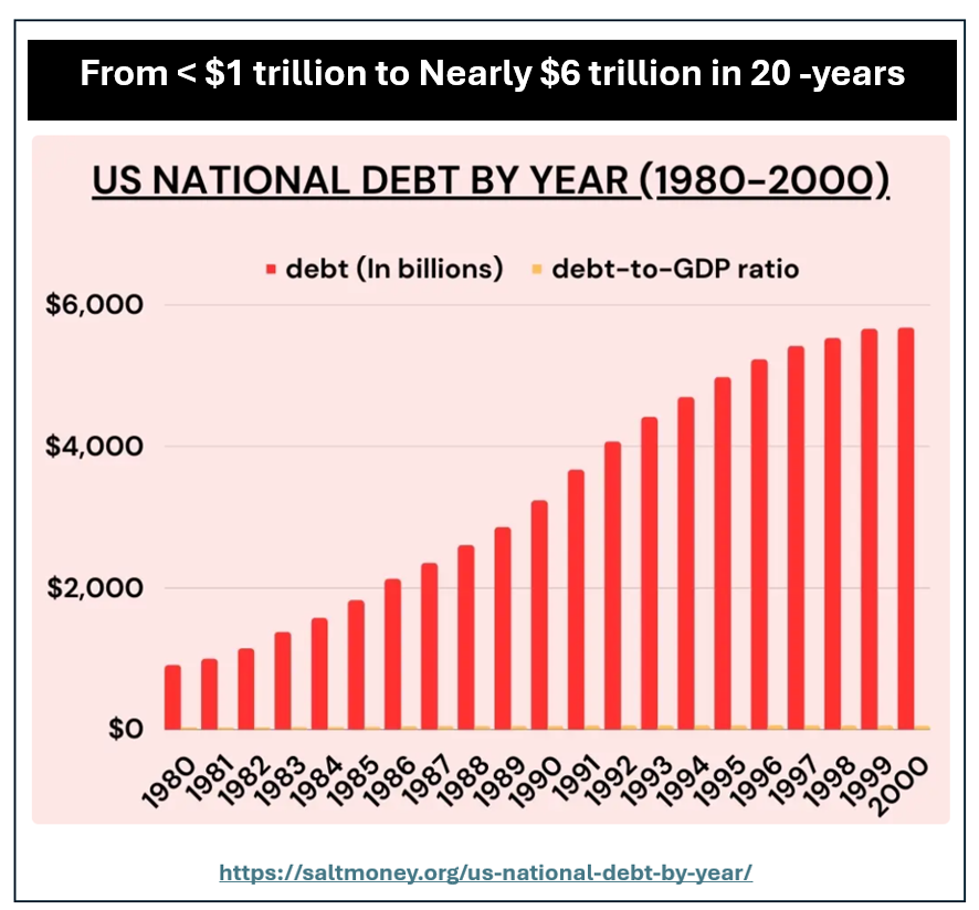 From 1980 through 2000 America’s national debt grew by almost six-fold.