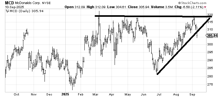 Then McDonald’s MCD, which had been flirting with new highs, gave way on Wednesday. It has held this uptrend line since July. It’s got support all the way down, but the stock is down five percent in the last few days. I would remind you that the retailers told us last week the consumer is in good shape.