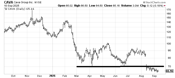 The once hot Cava CAVA gapped down a few weeks ago and hasn’t been able to muster an oversold rally.