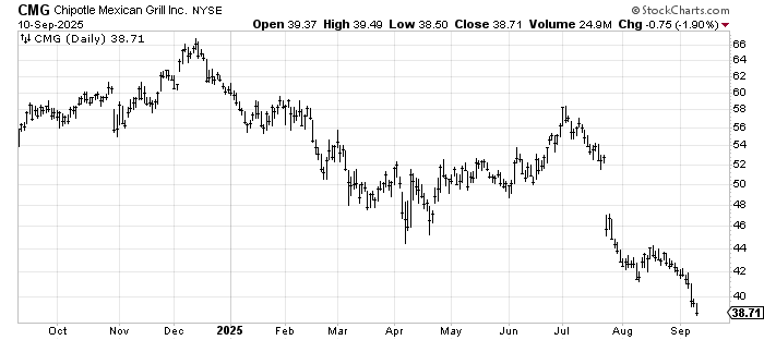 I know everyone is so excited over the AI stocks, but I have had my eye on some consumer-focused names. The restaurants are really struggling. I thought Chipotle CMG would stop sliding around 40, and it barely took a breather.