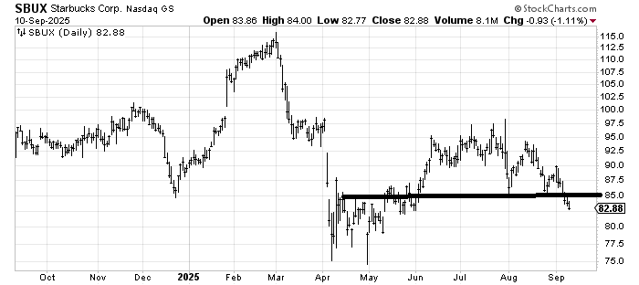 Starbucks has its issues, but even so, this once former favorite stock is now the lowest it has been since May.