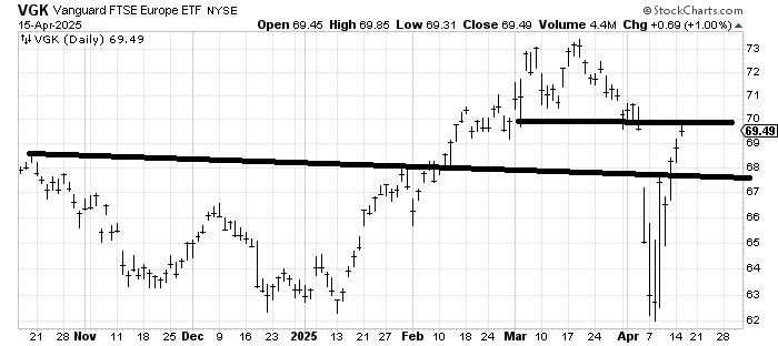We’ll look at one final chart: VGK. It is an ETF to be long Europe. It has filled the gap (thus is at resistance), but notice that it has rebounded much better than its US counterparts. Notice that it is now higher than last Wednesday’s rebound. Notice that, unlike the US indexes, it did not spend the months prior to the big decline going sideways but up. I think it pulls back to that lower line, and if it can hold there, it would be bullish.