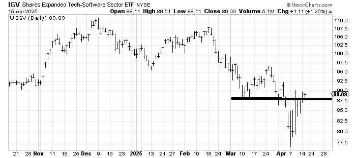 I thought IGV, an ETF to be long software stocks, had done well because it had gotten into resistance last Wednesday. But look at the action this week: it still can’t get over last Wednesday’s high. This chart has the best chance of eating through the resistance because, unlike all the other tech charts, it did not make a lower low, but thus far, the rebound has been lacking.