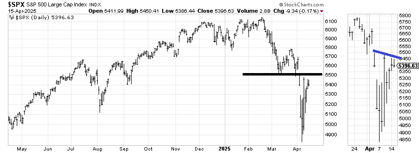 So, we may have quieted down the volume and the volatility for now, but the resistance is worth looking at. Let’s start with the S&P. The left-hand panel shows the resistance at 5500. The right-hand panel magnifies the last few weeks, where we have seen lower highs (blue line). Each rally has found sellers just a smidge lower, notably since last Wednesday’s big turnaround.