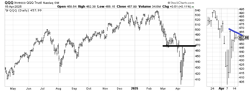 I kept thinking the QQQs could get to 470 and fill that gap, but even the QQQs can’t get back to last week’s high. It’s like one of those cartoons where every time the character lifts his head, someone is there to bop him on it.