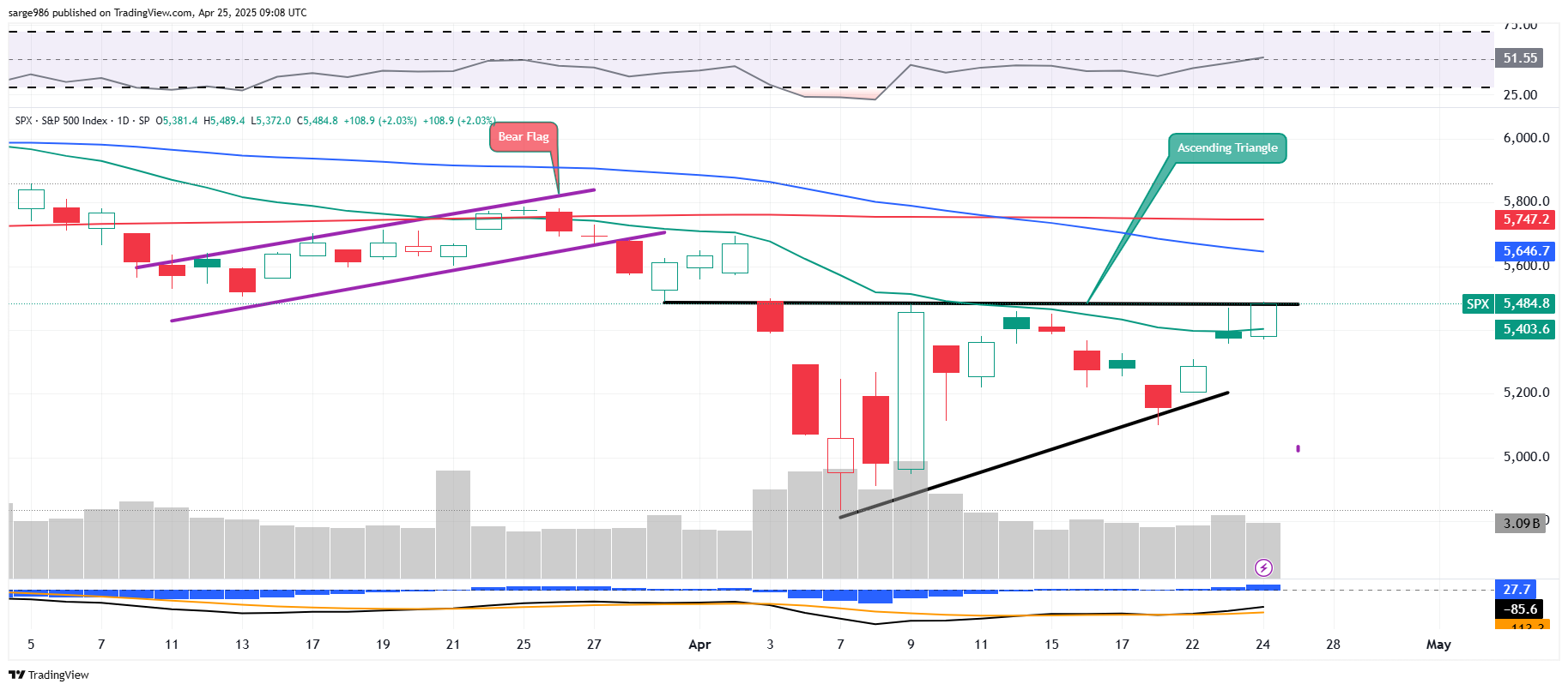 This is fine, too, though. The closing pennant has closed indeed, and the violent move prophesied a week ago, clearly was in an upward direction. Huzzah. Is all of the money back in the accounts? Define "all"... the S&P 500 has taken out the high of April 9th. and created a "baby" ascending triangle. Take a look: