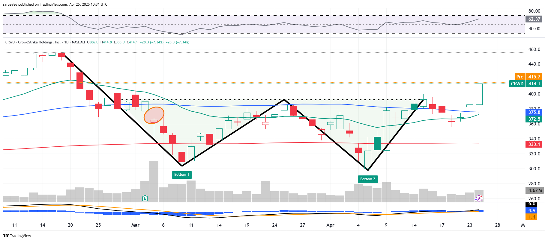 The double-bottom pattern of bullish reversal is as clear as a bell here. On Wednesday, CRWD took out its 50-day simple moving average and 21-day exponential moving average, drawing increased exposure from portfolio managers and swing traders alike. Going off of that $392 pivot, my target price for the shares is $470. I'm pretty sure that makes me the second highest target on Wall Street for CRWD, second only to Saket Kalia of Barclays whose target is $475 and who is rated at five stars by TipRanks.