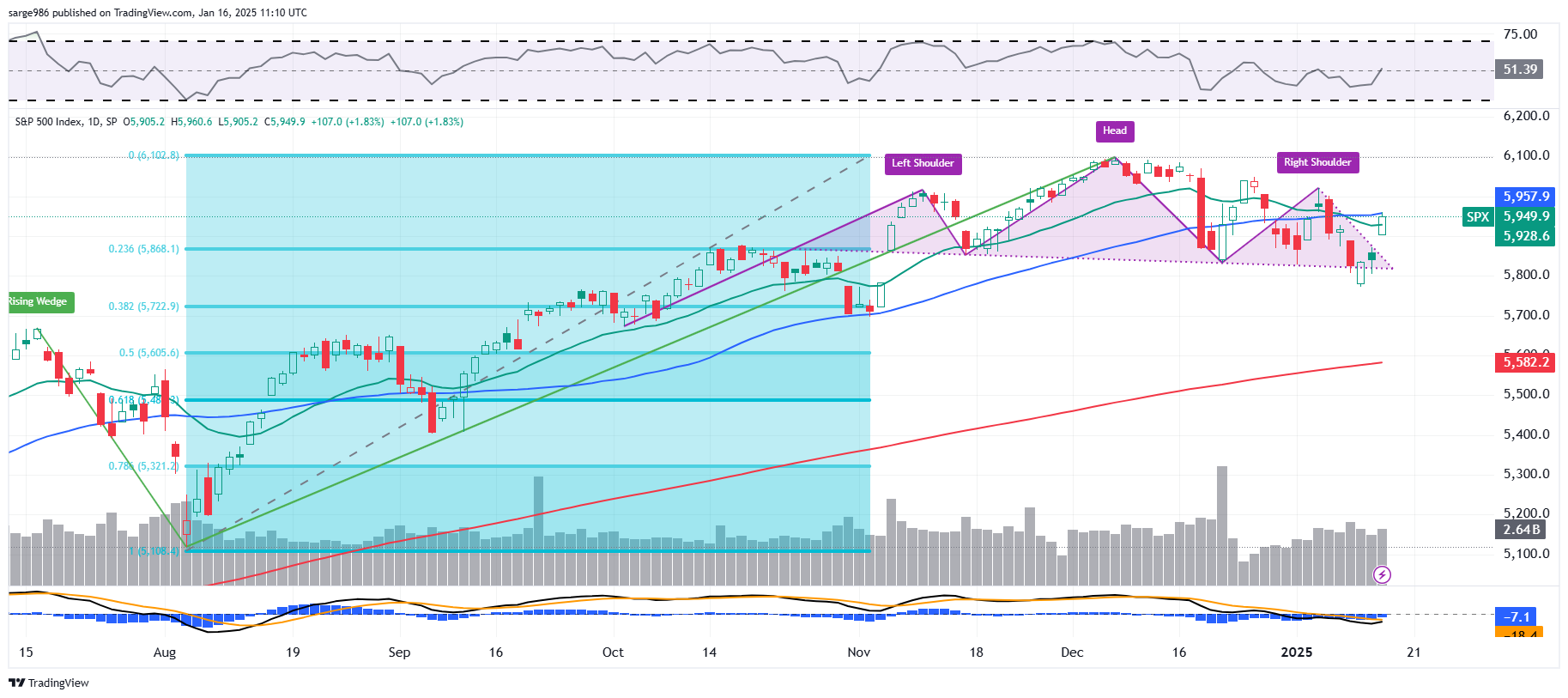 Readers will see in this chart of the S&P 500 that we still have a head-and-shoulders pattern in place, which is bearish and did produce a minor selloff. That said, on Wednesday, the index was up sharply on increased trading volume. For the S&P 500, Wednesday was the third day of a rally off of Monday's low, but the first of those days where volume expanded.