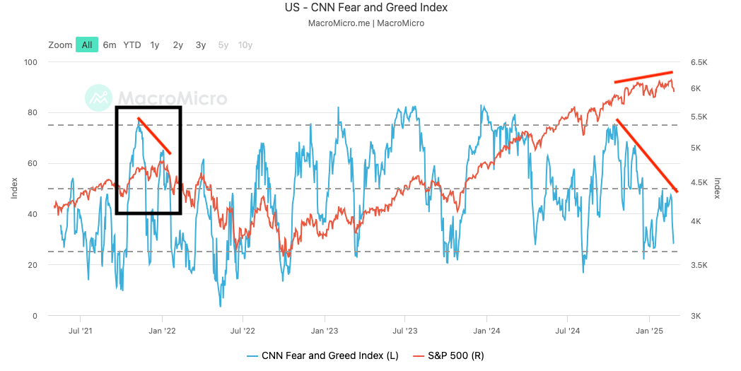 Where it is less effective is when Fear & Greed is already trending downwards, setting a lower high when stocks set a higher high, like in that period between 2021-22 shown in the black box below. That’s what we’ve had since the election. Stocks have gone up, while Fear & Greed has decayed.