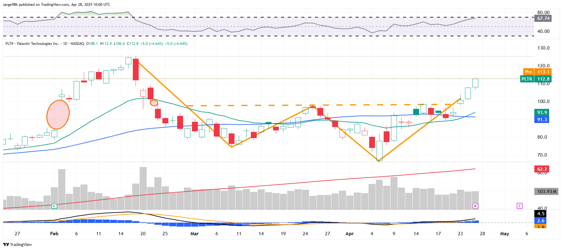The stock extended its move past pivot on Friday. The stock closed Friday's session up 4.64% for the day, up 20.26% for the week and up 26.28% from last Monday's low. Rock and Roll. Readers know that my current target price is $122. Palantir is expected to report on Monday, May 5th.