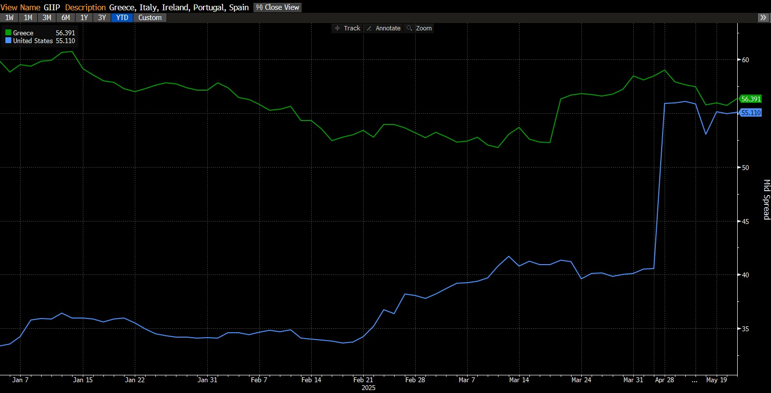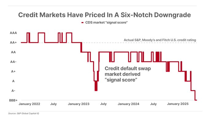 Just a day after the $3.8 trillion "Beautiful Bill" was passed in the House of Representatives, the cost of U.S. credit default swaps (which pay off in the event of default) have astonishingly intersected with the price of Greece's credit default swaps: