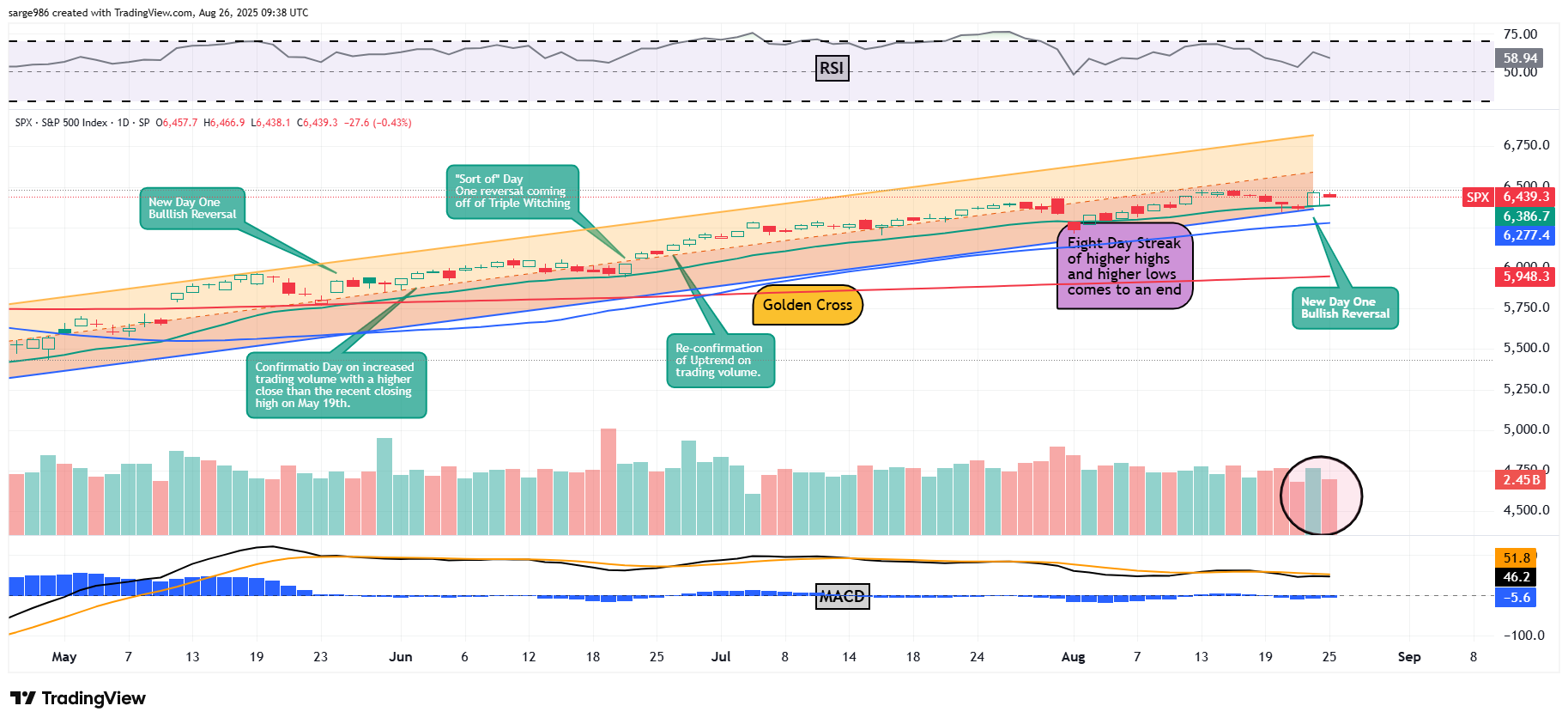 Within the black circle at the lower right hand on the chart, I have highlighted for readers, the higher trading volume on Friday's green candle day and the lower trading volumes on Thursday's and Monday's red candle days. This is bullish, as long as investors do see a second "up" day on increased trading volume. While the set-up is positive, the volume will be more difficult to achieve as the three-day weekend draws closer.